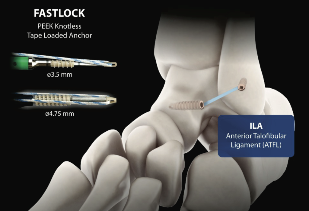 El procedimiento ILA implica una reparación directa de los ligamentos laterales, aumentada con una cinta fijada con anclajes como el anclaje Fastlock sin nudos cargado con cinta de GmReis.